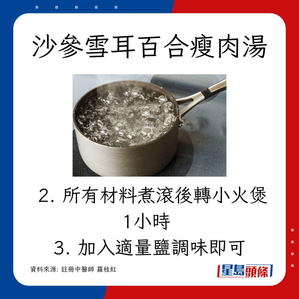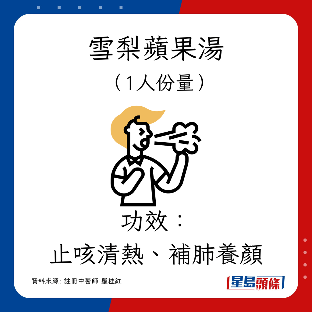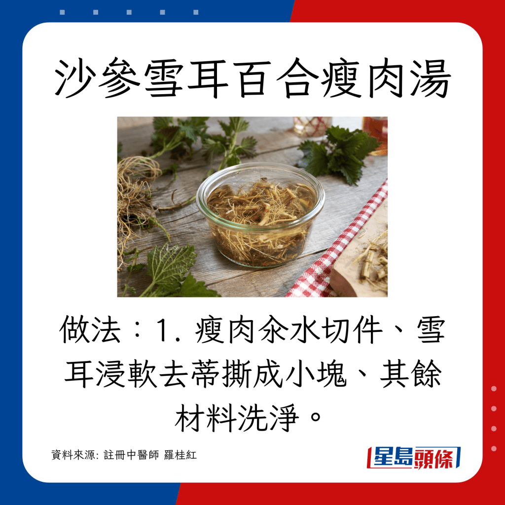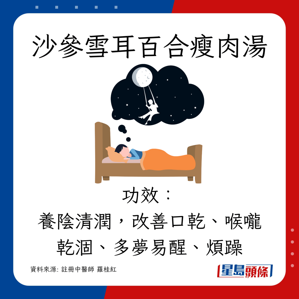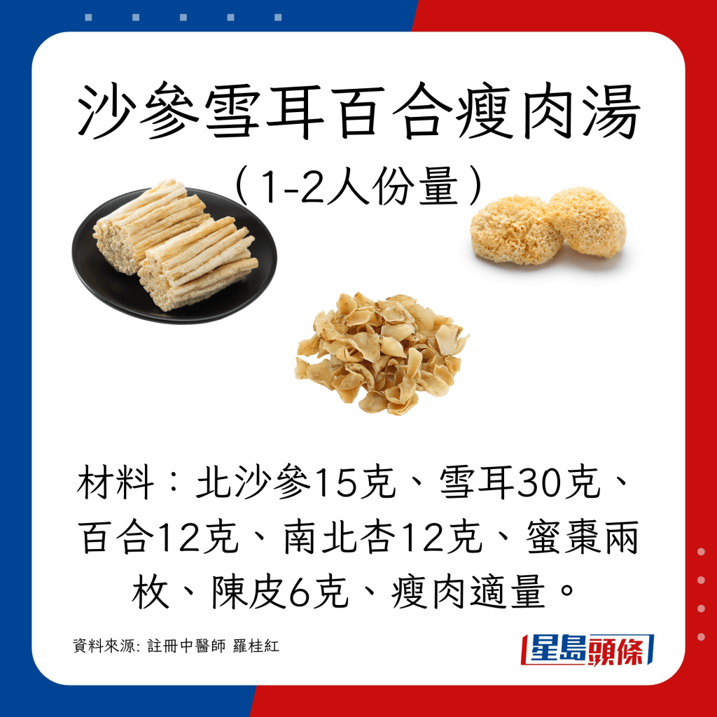 沙参雪耳百合瘦肉汤、雪梨苹果汤,功效、材料、做法如下: