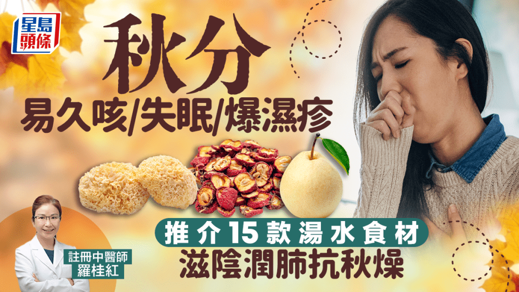 今天(9月23日)是秋分,是秋天的中间点。注册中医师罗桂红接受《星岛头条》访问指,秋分天气变得干燥,气温会逐渐降低,可能会引发咳嗽、失眠或湿疹等病。 罗医师讲解秋分气候特征及养生宜忌,并推介4款汤水及11款食材,有助滋阴润燥,在秋分时节好好养生。