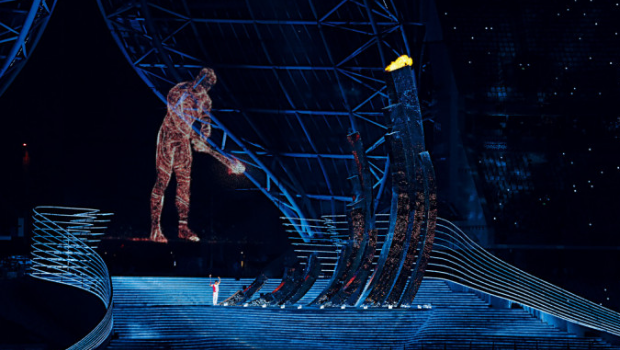亚运史上首个“数实融合”主火炬点燃仪式是开幕式的最大亮点。由上亿民众参与“在线点火”汇聚而成的“数码巨人”,穿越杭州城踏浪前来,跨进奥体中心体育场“大莲花”,与现场火炬手奥运游泳冠军汪顺共同点燃火炬塔。今届亦打破以往大型运动会惯例,现场改燃起电子烟花,体现绿色环保理念。