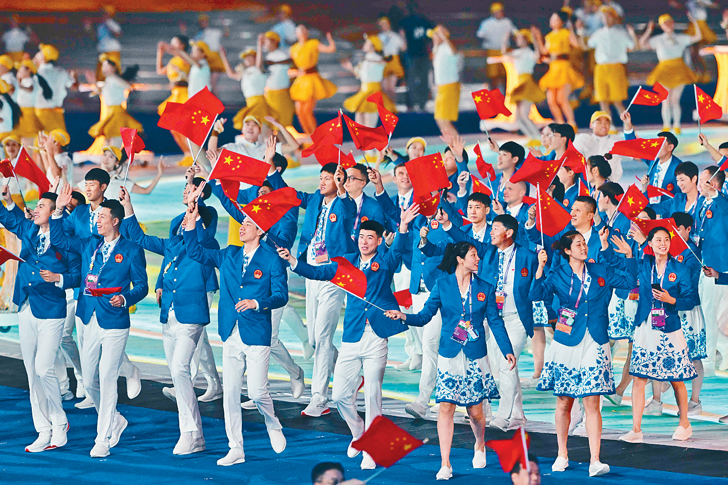 延期1年的杭州亚运,让来自45个国家和地区的12000多名亚洲运动员,再有机会同场竞技,彼此交流。伴随跃动的《我们的亚细亚》背景音乐,在志愿者的夹道欢迎下,选手们逐一进场。他们一手挥舞旗帜,一手高举手机,记录难忘时刻。中国体育代表团886名运动员在世界游泳冠军覃海洋、女篮队长杨力维两位旗手带领下亮相,引来全场欢呼。