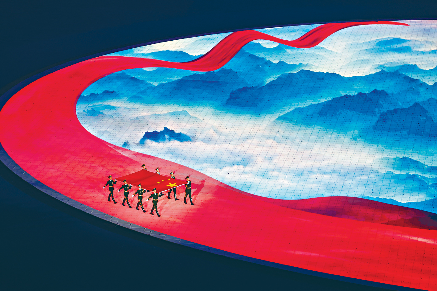 ▲解放军在云海效果衬托下,持五星红旗入场。中新社