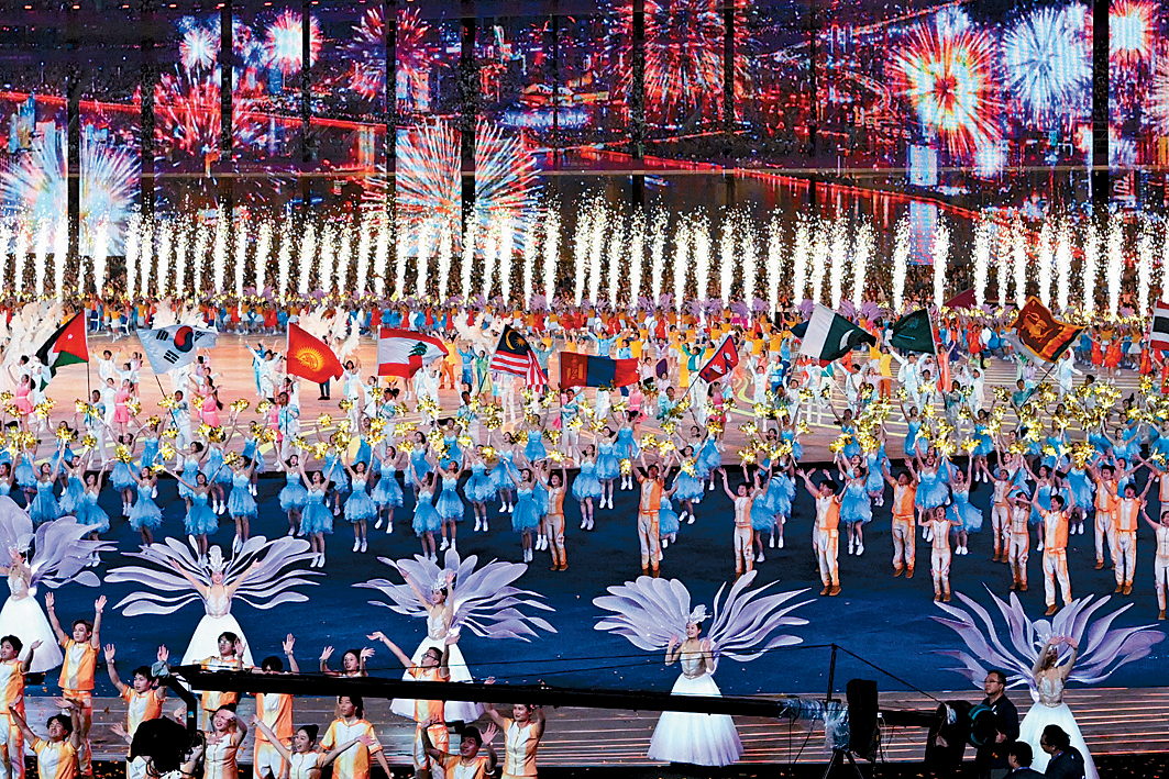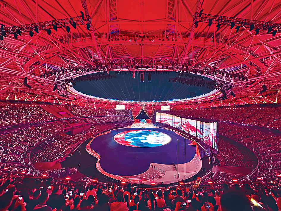 ▲亚运开幕礼于有“大莲花”之称的杭州奥体中心体育场举行。中通社