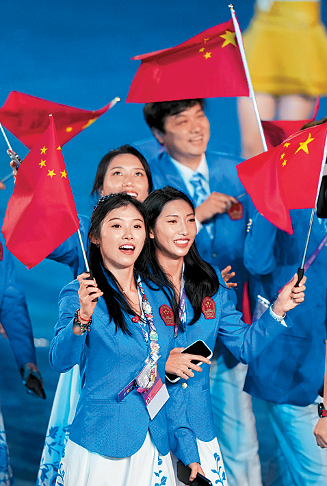 ▲有中国“跨栏美女”之称的吴艳妮挥舞国旗进场。中新社