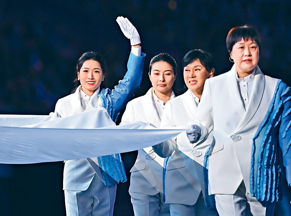 ▲8位持旗手带领亚奥理事会会旗入场,包括跳水皇后郭晶晶(左二)及一代蛙后罗雪娟(左一)。