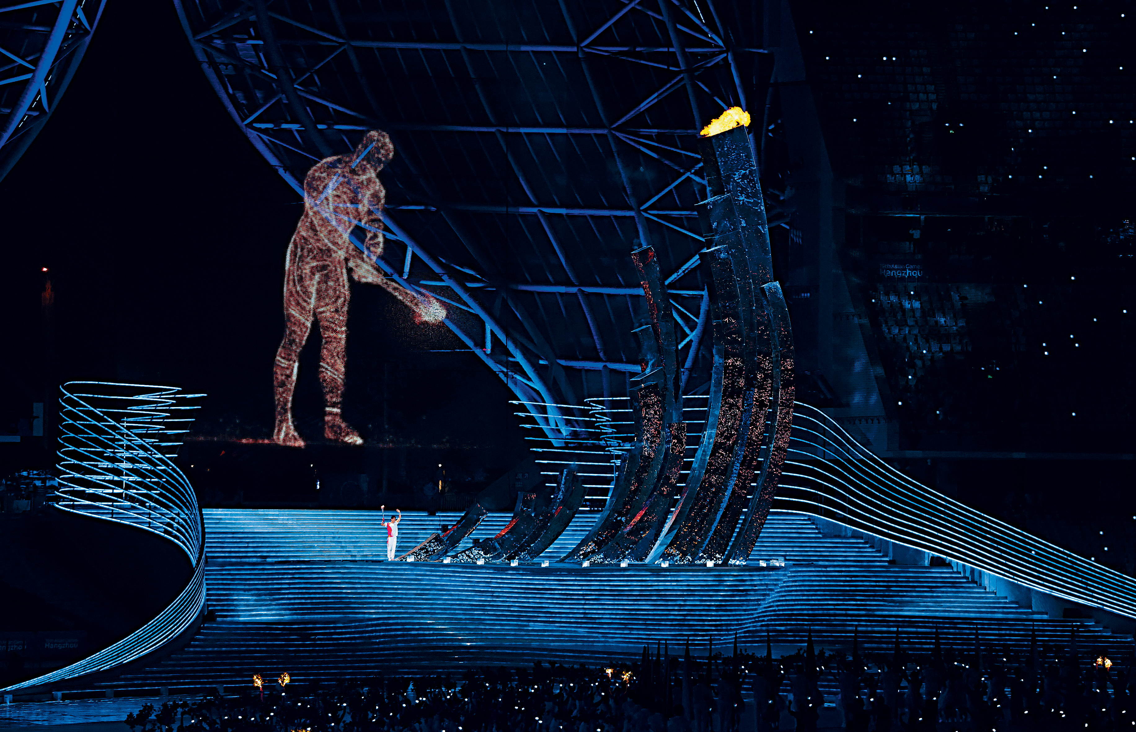 ▲亚运史上首个“数实融合”的点火仪式成最大亮点,虚拟火炬手和浙江籍游泳运动员汪顺联动共燃主火炬塔,把全场气氛推向高潮。