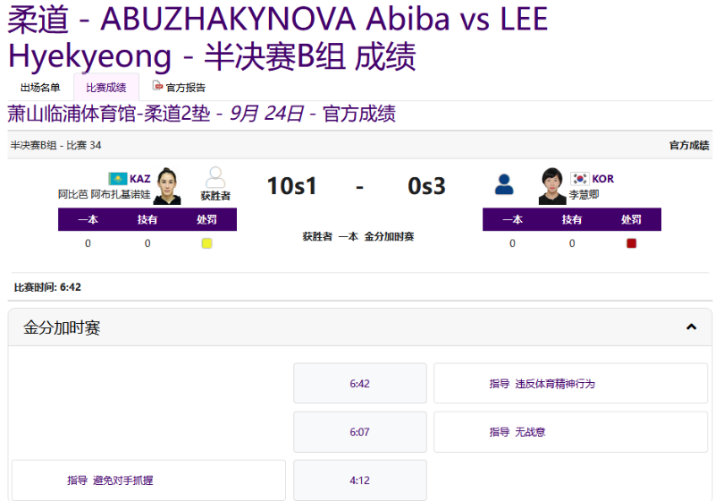 哈萨克斯坦选手由此直接晋级决赛,最终获得银牌 ,金牌被日本选手角田夏实摘得。