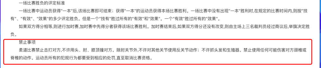 据中国柔道协会官方网站,根据柔道比赛规则,柔道比赛禁止击打对方,不许用头、肘、膝顶撞对方。除肘关节外,不许对其他关节使用反关节动作;不许抓头发和生殖器。禁止使用任何可能伤害对方颈椎或脊椎的动作。运动员所有的犯规行为都要受到相应的处罚,直至取消比赛资格。