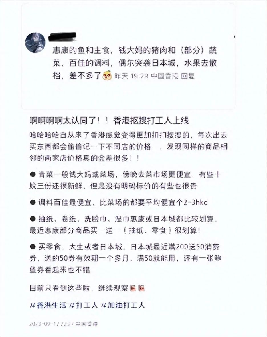这位港漂网友在社交平台上发帖,附上一位网友分享在香港买餸好地方的截图,并以“啊啊啊啊太认同了!!香港抠搜打工人上线”为题发文回应。