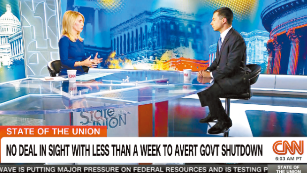 ▲联邦预算案将于30日到期,如无法达成协议,联邦政府将面临停摆。运输部长布迪治(右)在电视节目中呼吁,众院共和党人马上让步,让政府继续运作。电视截图