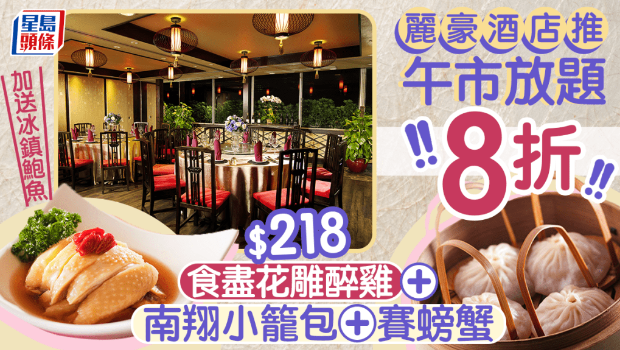 丽豪酒店龙门客栈推出快闪限量8折午市点心自助,低至$218便可以任食2小时的京沪淮阳菜,包括南翔小笼包、虫草花鲜鸡汤等逾 40 款点心、汤羹、小炒、主食、甜品美食,更额外加送冰镇鲜鲍鱼,立即查看以下优惠详情。