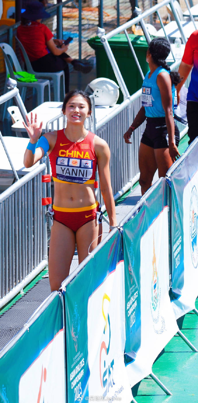 吴艳妮在8月的成都世大运跑出13秒以内,最终跑出12.76秒,力压应届亚锦赛冠军、印度跑手Jyothi Yarraji夺得银牌,同时也让她达到巴黎奥运的标准。今次杭州亚运再次在内地出战,吴艳妮成为中国田径队的奖牌希望。她于开幕礼中与其他运动员一样身穿蓝西装配青花瓷花纹的白裙,同时手上则挥舞着国旗,并突然对着观众跳起比心,相当可爱。