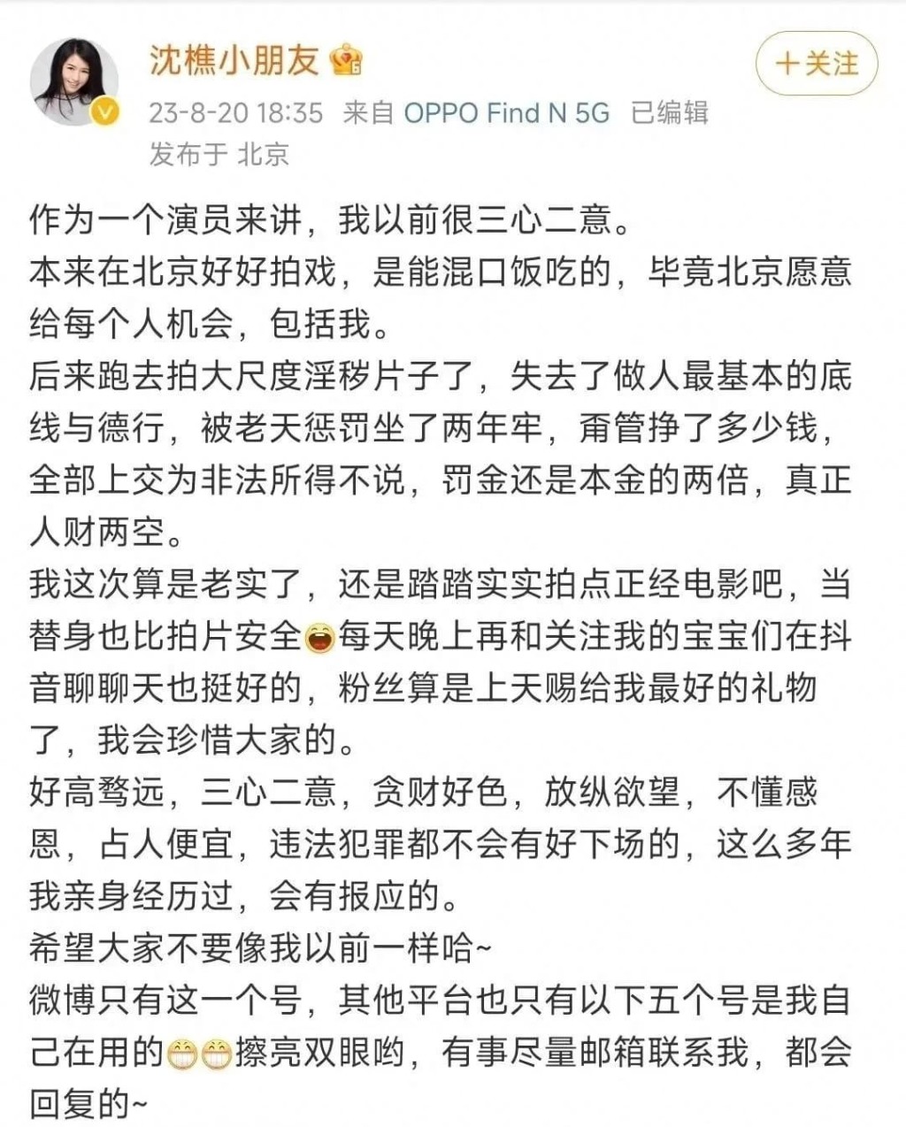 出狱后沉寂两个月,沈樵在8月贴出长文宣布复出,检讨自己以前失去做人的基本底线,打算以后踏踏实实拍些正经电影。她亦再次在微博、快手等多个社交平台活跃,又大方开直播分享自己经历。有网民在评论区问沈樵还会不会继续搞“黄色”?沈樵回答:“不搞了。”看来真是洗心革面要重新做人。