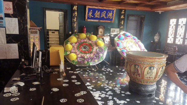 近日上海警方接报,一间酒店职员上班时,惊见大堂被布置成经理的“灵堂”,放上大型花圈和“遗照”,地上撒满纸钱,沿街玻璃被喷上“一路走好”4个大字。员工确认经理还活着后赶紧报警,经查发现原来是已离职员工的恶作剧。