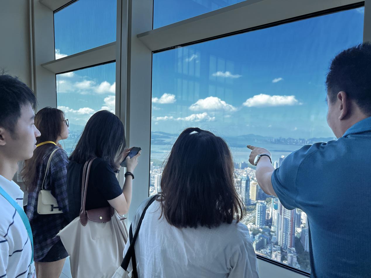 若想把深圳城市风光尽收眼底,最佳的观光点莫过于深圳第一高楼——深圳平安金融中心。深港澳媒体一行到达深圳平安金融中心东门,可见高楼直插云端、蔚为壮观。
