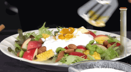 混和玉米、生菜、苹果连皮、枝豆、坚果后,加适量乳酪,最后撒上少许姜黄粉,即可食用。