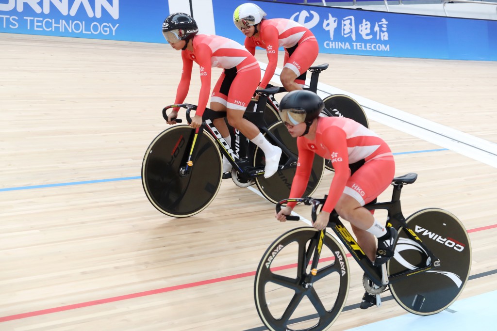 淳安界首体育中心自行车馆举行的杭州亚运场地单车赛,香港单车队周三出战女子团体追逐赛,成功压过韩国勇夺铜牌,是港队在此项目的首面亚运奖牌。