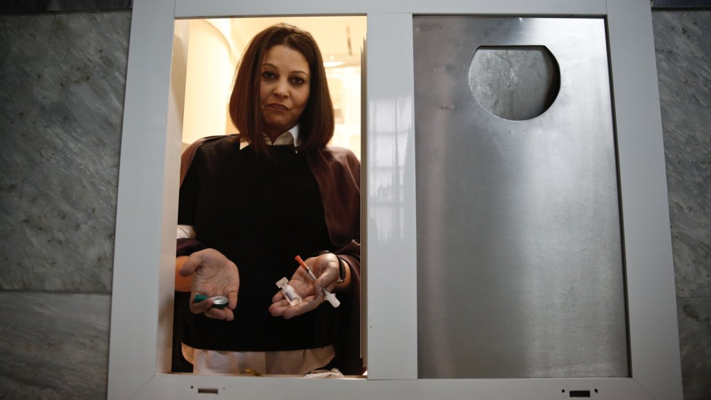 ▲希腊禁毒组织(OKANA)员工展示吸毒室提供的即弃针筒和即弃汤匙等用具。路透社
