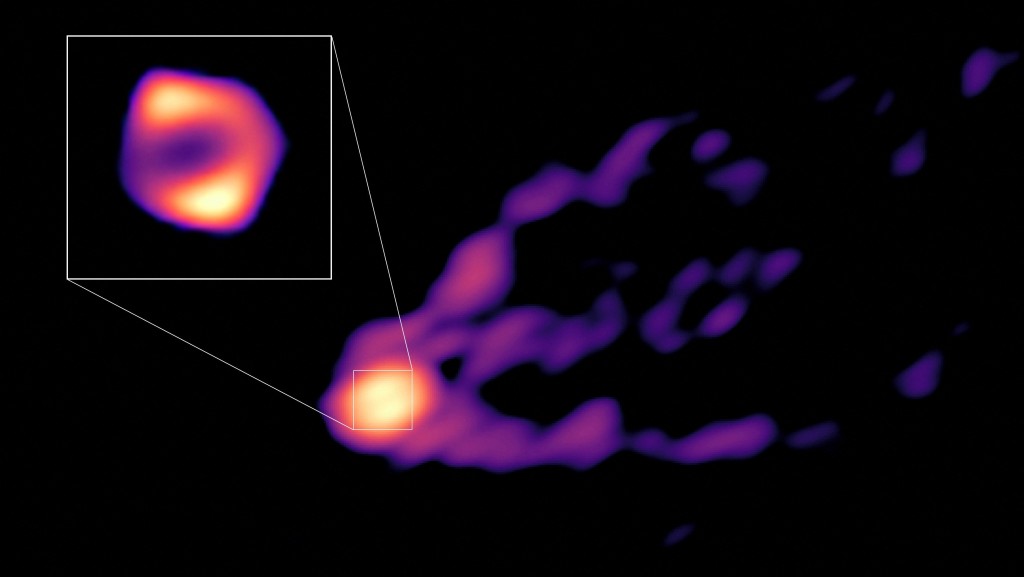 ▲在3.5毫米波长观测到的M87黑洞及喷流同框“全景图”。 路透社