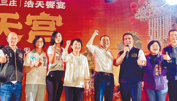 ▲台中市浩天宫昨天晚上举办大庄妈7天6夜北港徒步进香起马宴,卢秀燕(左四)与侯友宜(左五)一同参加,蔡壁如(左二)也同台,现场民众高喊“侯友宜冻蒜”。