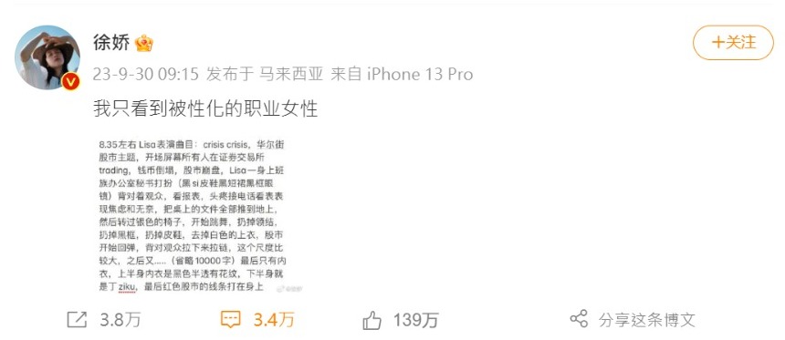 ▲徐娇批评《疯马秀》是“性化女性”,该微博已有逾三万条评论。