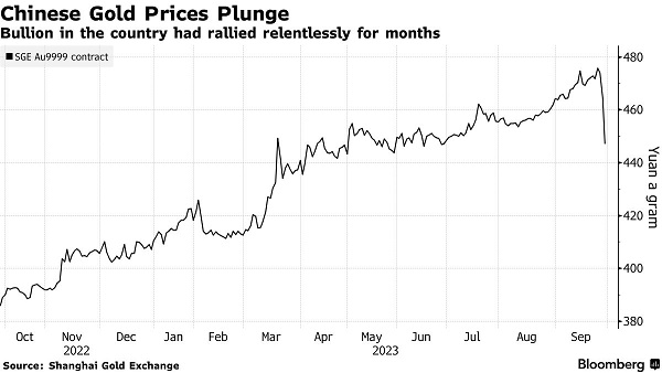 国内黄金期货及现货在9月创下历史新高后,突然调头暴跌,创3年来最大单周跌幅。现货黄金在十一国庆日前最后一周跌幅达5.2%,价格由历史高位480.5元(人民币,下同),回落450元以下,期货黄金同期亦下跌2.33%。