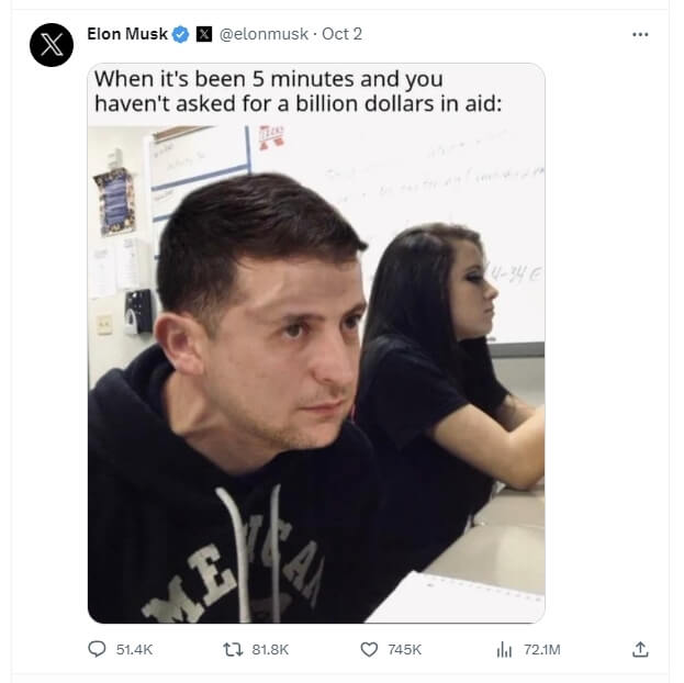 马斯克昨天稍早于社群媒体平台X发布泽连斯基(Volodymyr Zelenskyy)的迷因哏图,图片内文写道:“5分钟过去了,你还没有要求10亿美元的援助。”