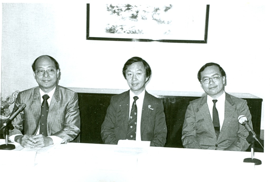 ▲1987年候任中大校长时的高锟(中)与时任中大敎务长杨汝万(左)及秘书长梁少光(右)见记者。星岛资料图