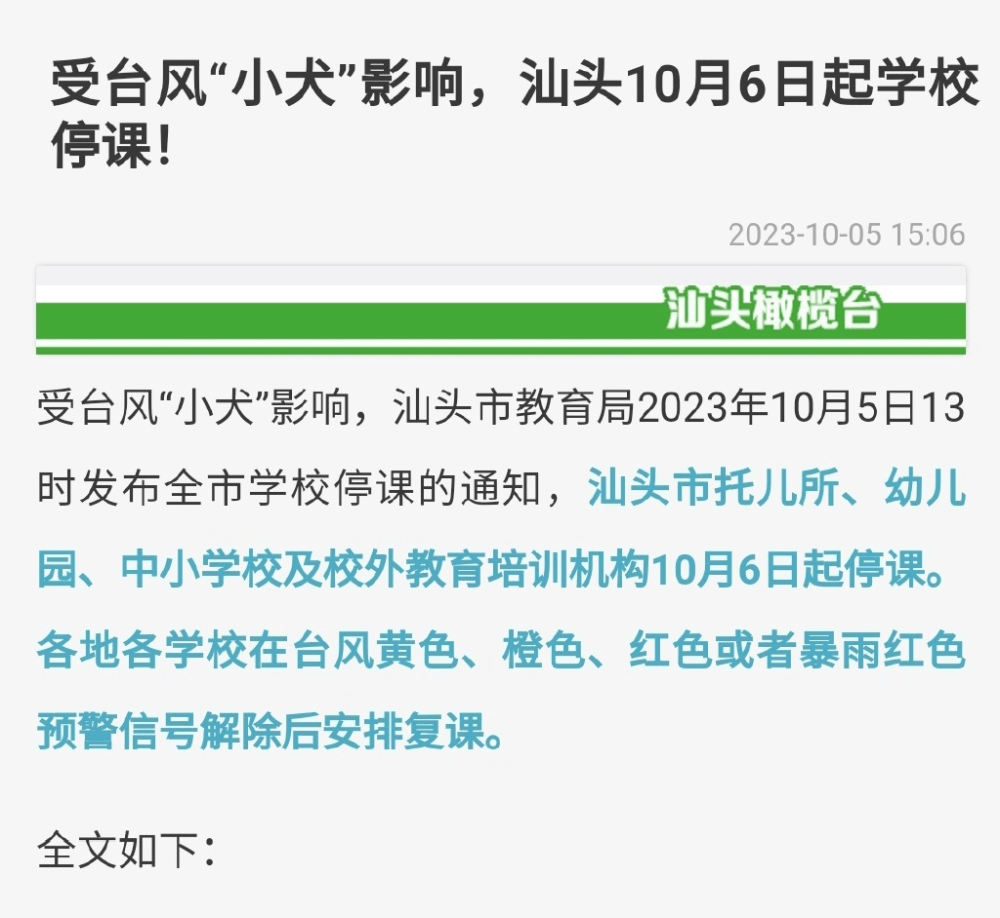 受台风“小犬”影响,受台风“小犬”影响,汕头全市托儿所、幼儿园、中小学校及校外教育培训机构10月6日起停课。 在台风黄色、橙色、红色或者暴雨红色预警信号解除后安排复课。