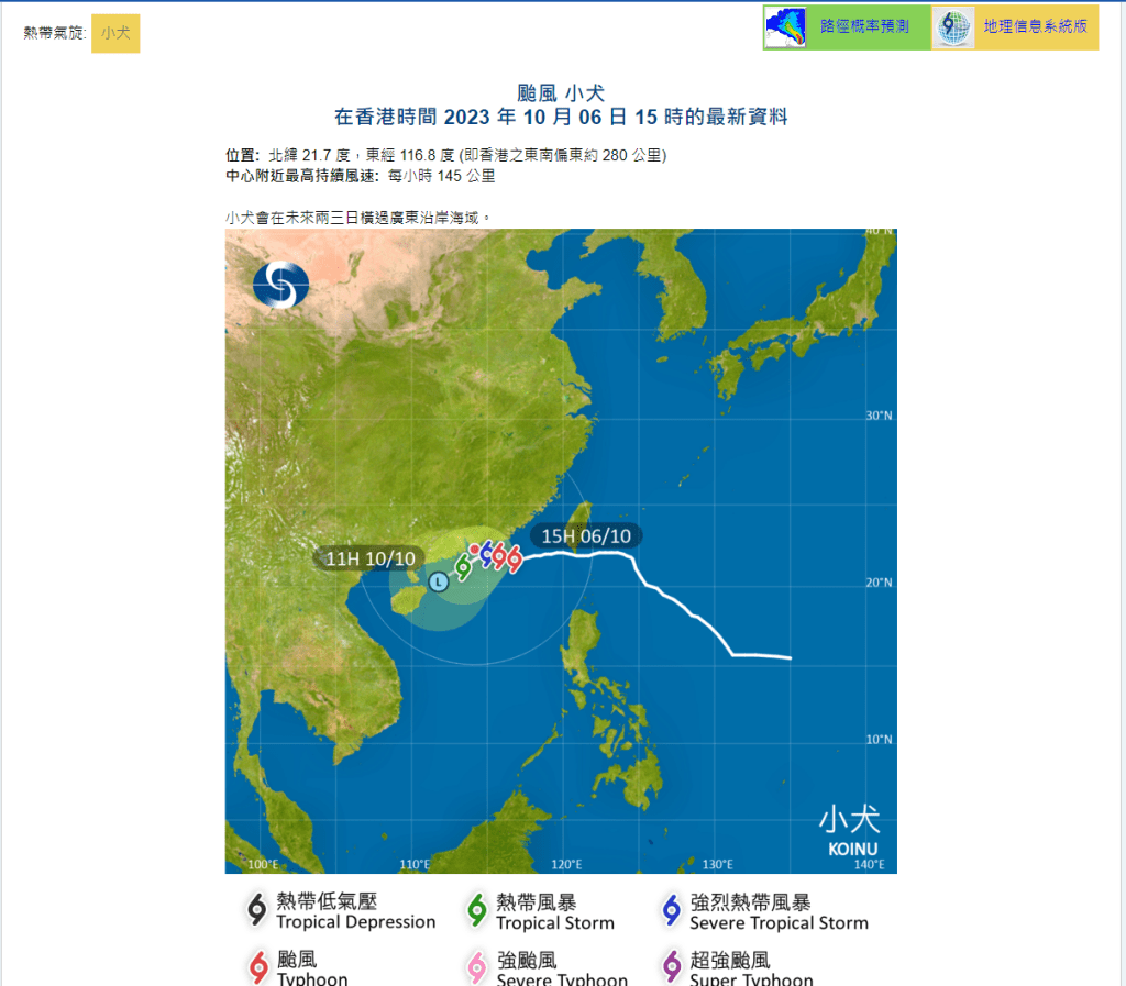 一号戒备信号现生效,天文台今日(6日)上午9时45分指,过去一两小时,台风小犬略为増强,而随着小犬继续靠近广东东部沿岸,本港风力今日会逐渐增强,天文台会在今午5时40分改发三号强风信号。