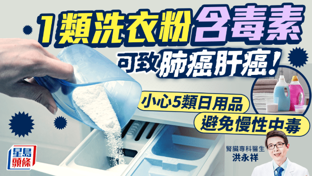 用错洗衣粉也会有致癌的风险?有医生指出,有5类日常生活用品潜藏毒素,不当使用可致慢性中毒,若洗衣粉含有1种成分,有机会引致肺癌或肝癌。