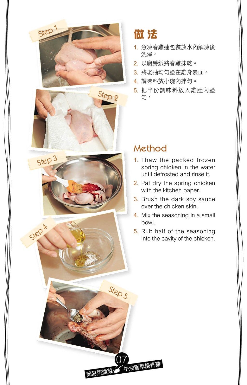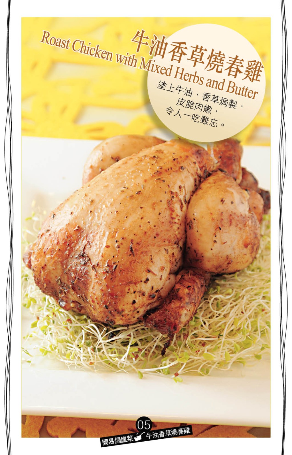 掌握食谱秘诀,就可做出皮脆肉嫩的牛油香草烧春鸡。重点是清洗春鸡后,要彻底抹干,才能焗至香脆。先在干身的春鸡涂上老抽,将香草、盐、橄榄油及胡椒拌匀,抹在鸡皮及鸡腔,再置于架上放入焗炉烤熟。