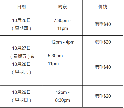 10月28日(星期六)/12pm - 4pm ; 5:30pm - 11pm