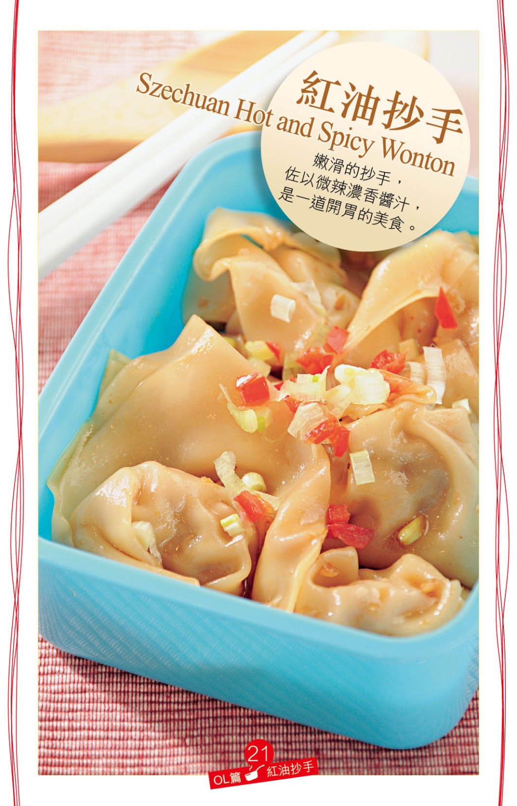 做一大盘饺子作午餐,别具风味。四川名食红油抄手的做法简单,购买现成饺子皮,将免治猪肉与蒜蓉、葱碎及调味料拌成馅料,以饺子皮包裹成猪肉抄手,以滚水煮熟,伴红油酱汁吃。香辣的红油酱汁则用酱油、麻油、白醋、糖、辣油及花椒粉调成,辣度可随喜好调校。