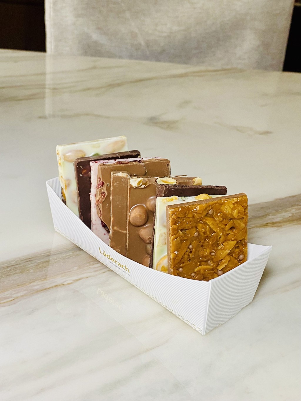 饭后不忘走到商场地库,前往历史悠久的瑞士Laderach朱古力店选购久违的朱古力品牌。店中Pralines及Truffles等朱古力一应俱全,可是Fifi钟情FrischSchoggi果仁朱古力块的味道口感,因而选了集杏仁黑朱古力块、红莓牛奶朱古力块等十多款不同口味于一身的FrischSchoggi Boat杂锦朱古力块(199元人民币/330克),回港每日一块,以之伴茶,乐透半天。