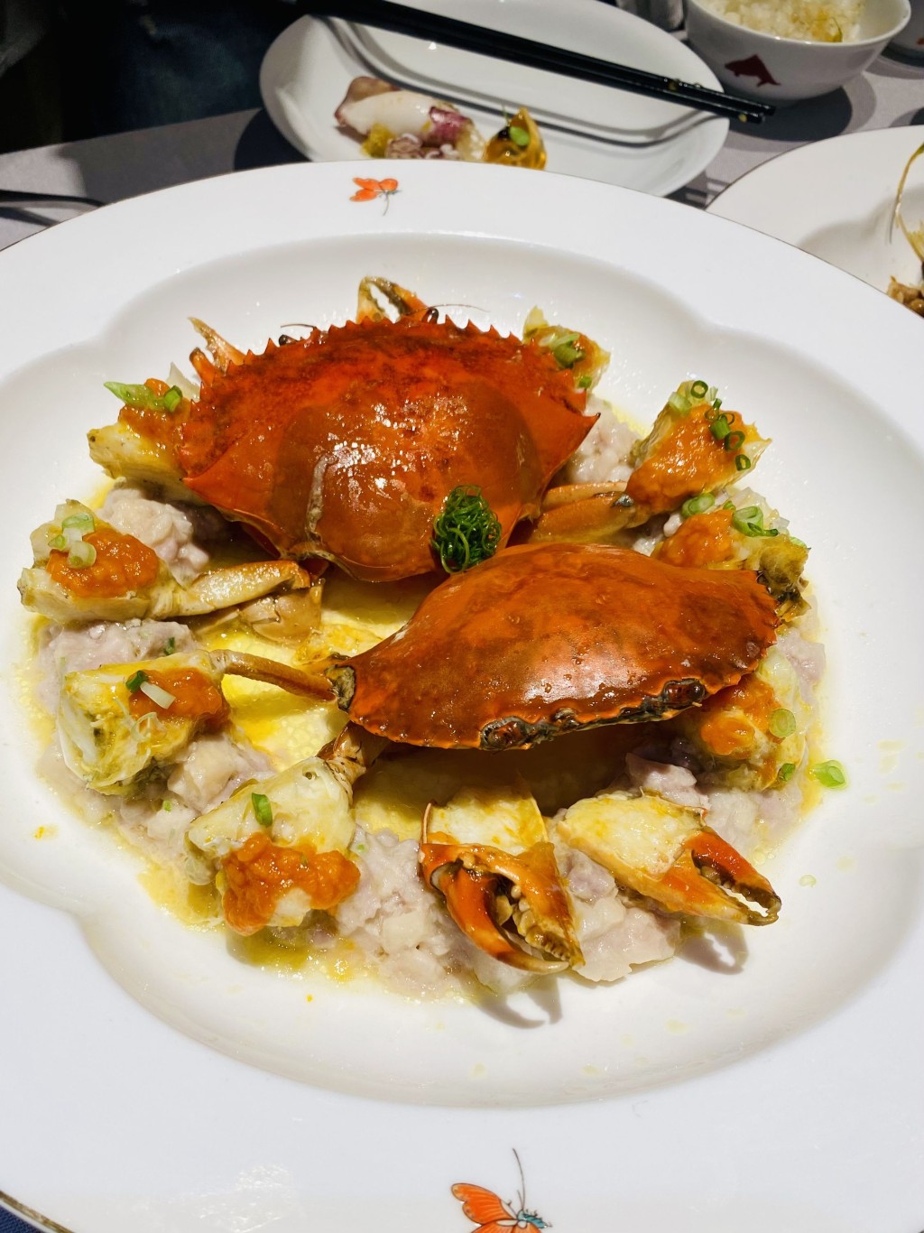 接着的招牌至正肉饼蒸膏蟹(468元人民币),顶层两只蟹肉满膏肥,佐以底层拌入马蹄粒的手剁五花腩肉饼,前者马蹄粒清甜爽口,后者五花肉韧性得以保留。蒸煮时肉饼尽吸上层蟹汁精华,味道清甜鲜美可想而知。至于黄椒酱蒸鱿鱼筒(88元人民币),先将鱿鱼筒酿入粉丝后蒸煮,佐以微辣的黄椒酱,鲜辣迷人。最后甜品至正红糖糕(48元人民币)微甜湿润。燕麦绿茶薄餐(48元人民币)则软糯口感欠奉,丁点失色。