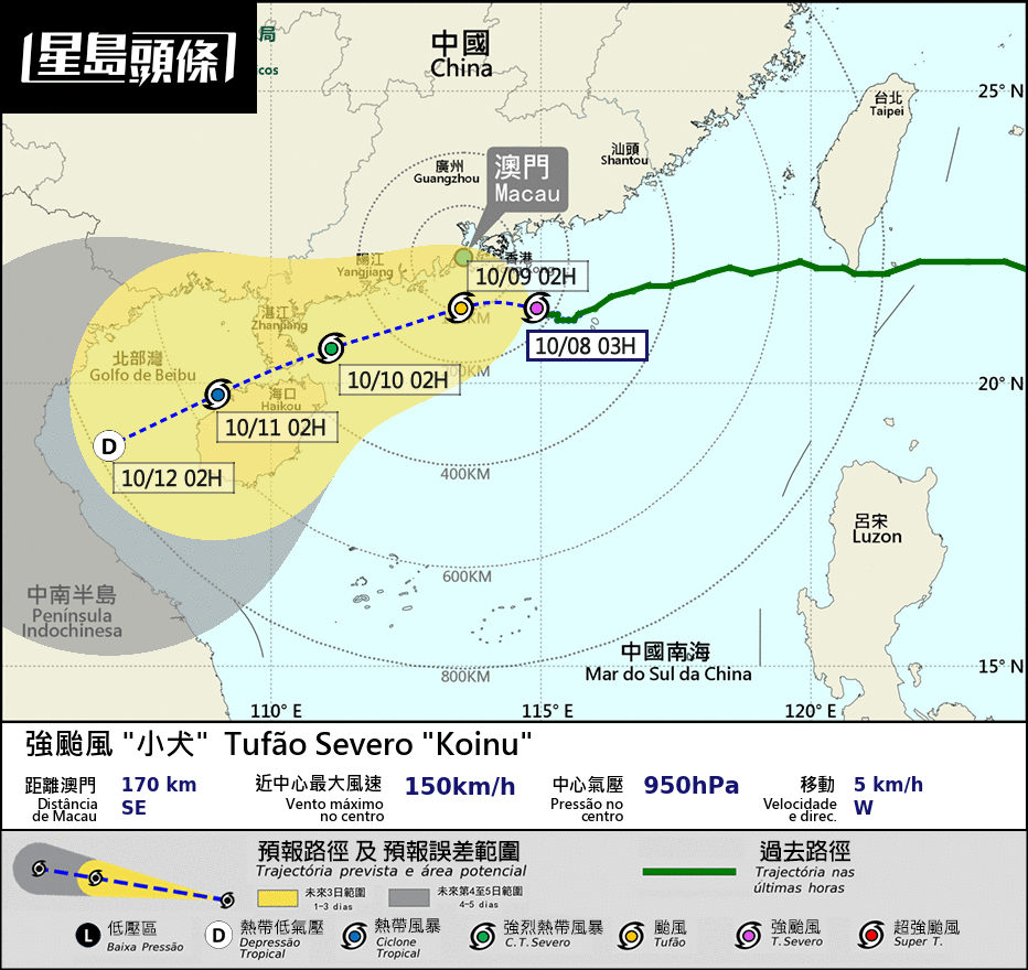 【16:45】天文台预料,小犬会在今晚(10月5日)至明早(10月6日)与香港保持约400公里或以上距离,香港普遍吹强风的机会不大,一号戒备信号会至少维持至明日中午。