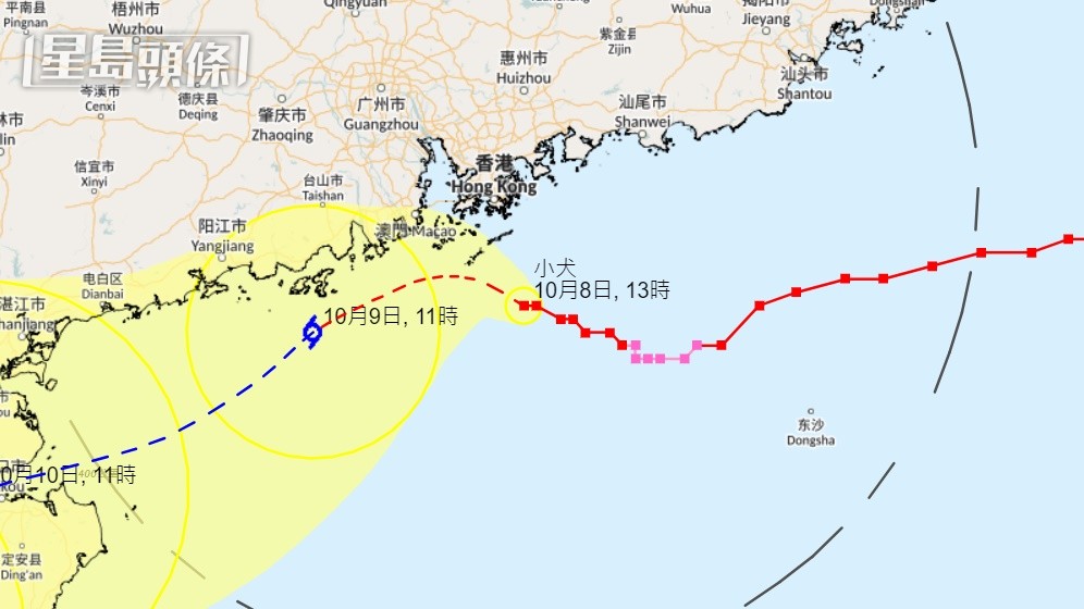 若小犬维持现时强度,其飓风区预料会在今晚颇为接近香港南面海域,该区风力可能会再进一步增强。天文台会视乎本地风力变化,评估是否需要改发更高热带气旋警告信号。