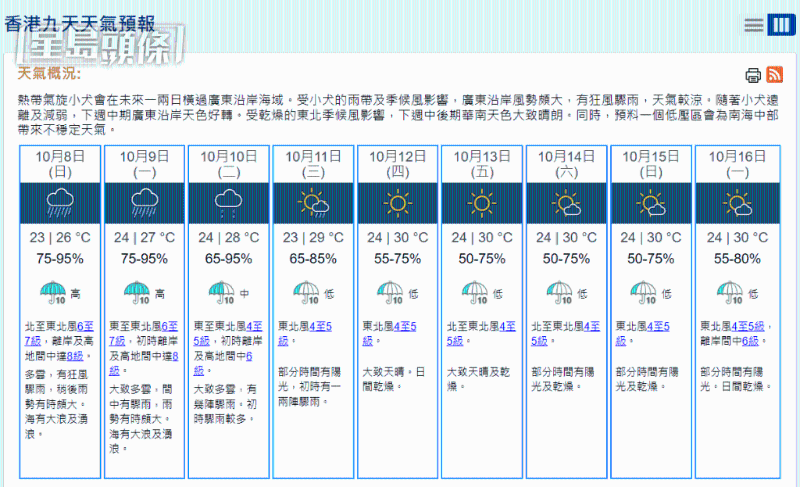 【10:40】香港天文台宣布,将于下午12时40分发出八号热带气旋警告信号,香港风势将会增强。
