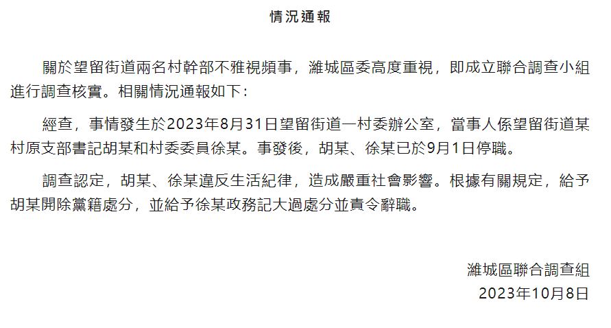 联合小组通报指,事情发生于今年8月31日,望留街道一村委办公室,当事人为望留街道某村原支部书记胡某和村委委员徐某。事发后,胡某、徐某已于9月1日停职。