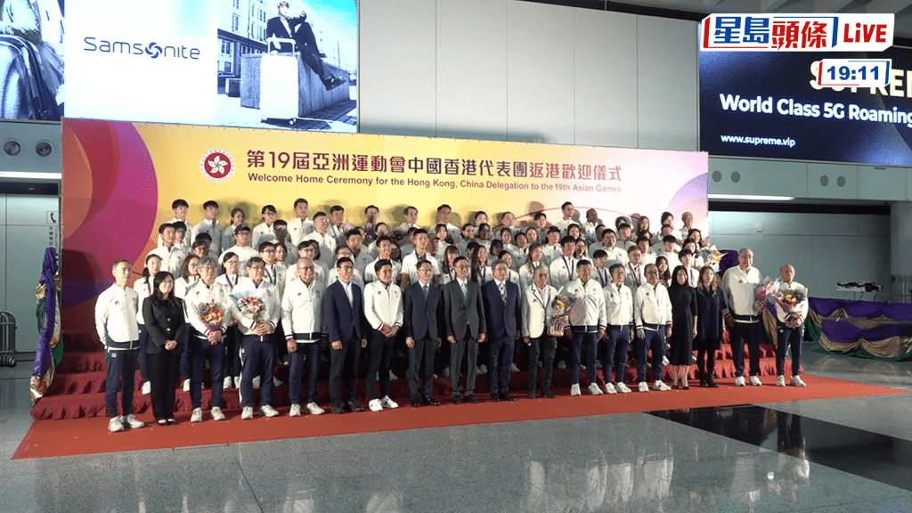 杭州亚运会完满结束,香港代表团取得8金、16银和29铜共53面奖牌的历史佳绩。港队成员今日(9日)凯旋回港,特区政府将在香港国际机场举行欢迎仪式,政务司副司长卓永兴、文化体育及旅游局局长杨润雄和康乐及文化事务署署长刘明光出席。