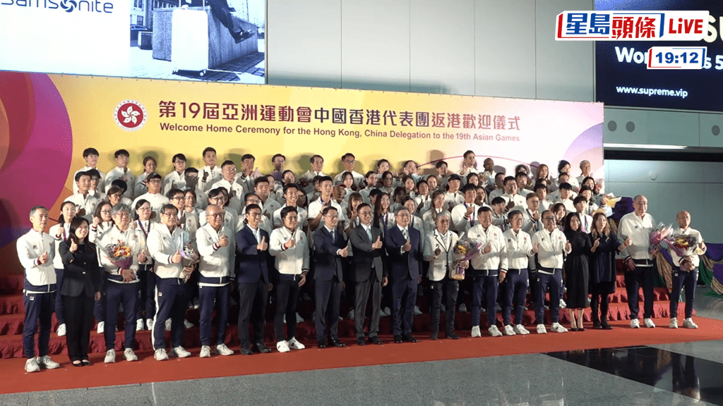 ▲运动员凯旋回港,在机场与众嘉宾合照。 直播截图