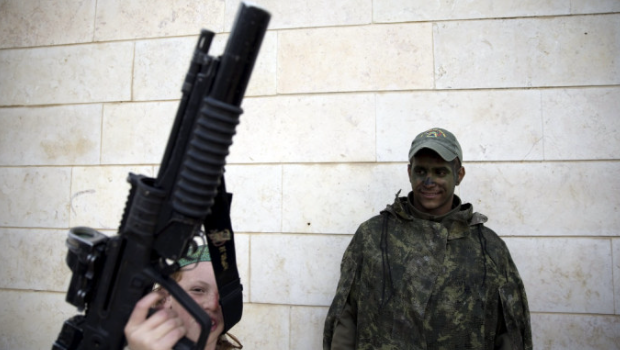 ▲2015年以色列纪念建国67年,以军在约旦河西岸基亚特阿尔巴定居点展示装备,一名士兵看着男孩拿起步枪。 路透社