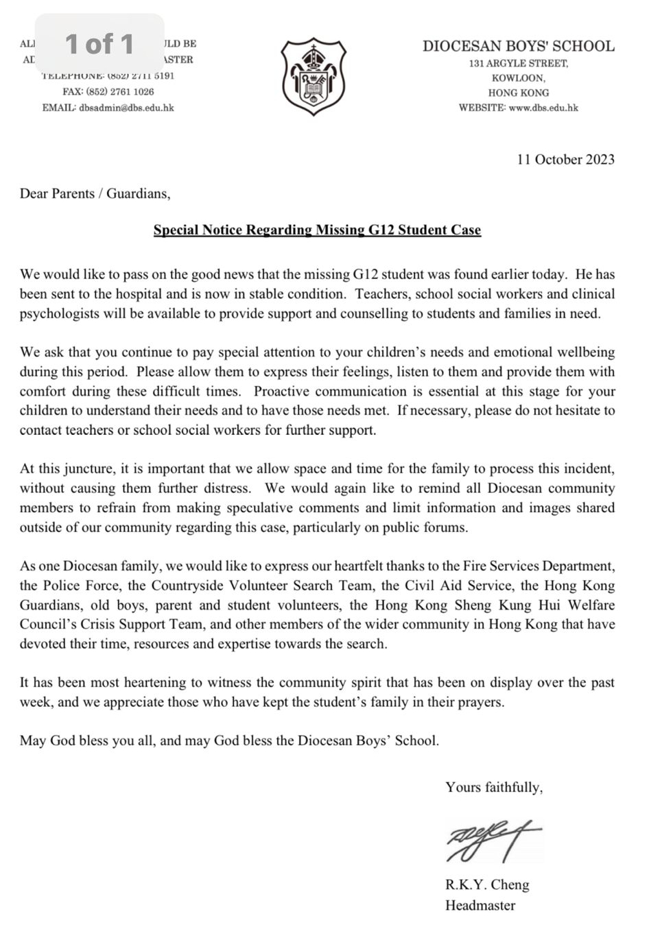 ▲拔萃男书院校长郑基恩向家长发通告,公布曾宪哲安全获救消息。