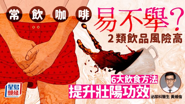 不举、难勃起,可能与饮食习惯有关。有泌尿科医生指,若过量喝2类饮品容易导致不举,其中包括咖啡。他提醒,若要增强壮阳功效,避免不举,就要避开6大饮食禁忌。