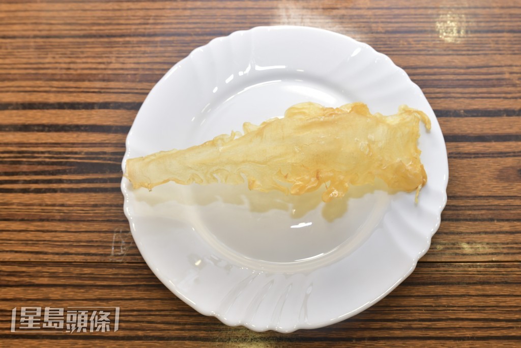 性价比高的鳕鱼胶及鸡泡胶,浸发后体积倍增,相比贵价花胶如白花胶或筒胶更划算,是抵食花胶之选。 每斤约千元的鳕鱼胶,经过浸水及焗水工序后,由原先长24厘米,发大至50厘米,足足发大了一倍有多,浸发过的鳕鱼胶亦比干货更厚身。
