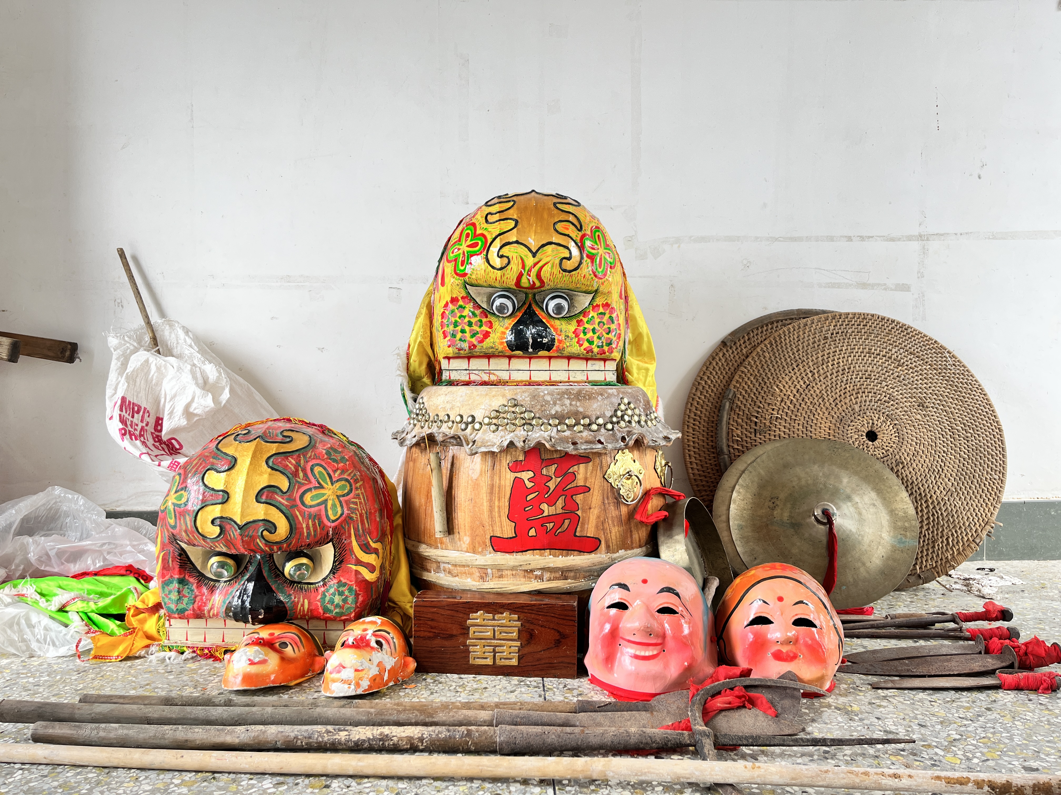 ▲斗牛狮表演时的伴奏乐器、表演道具。