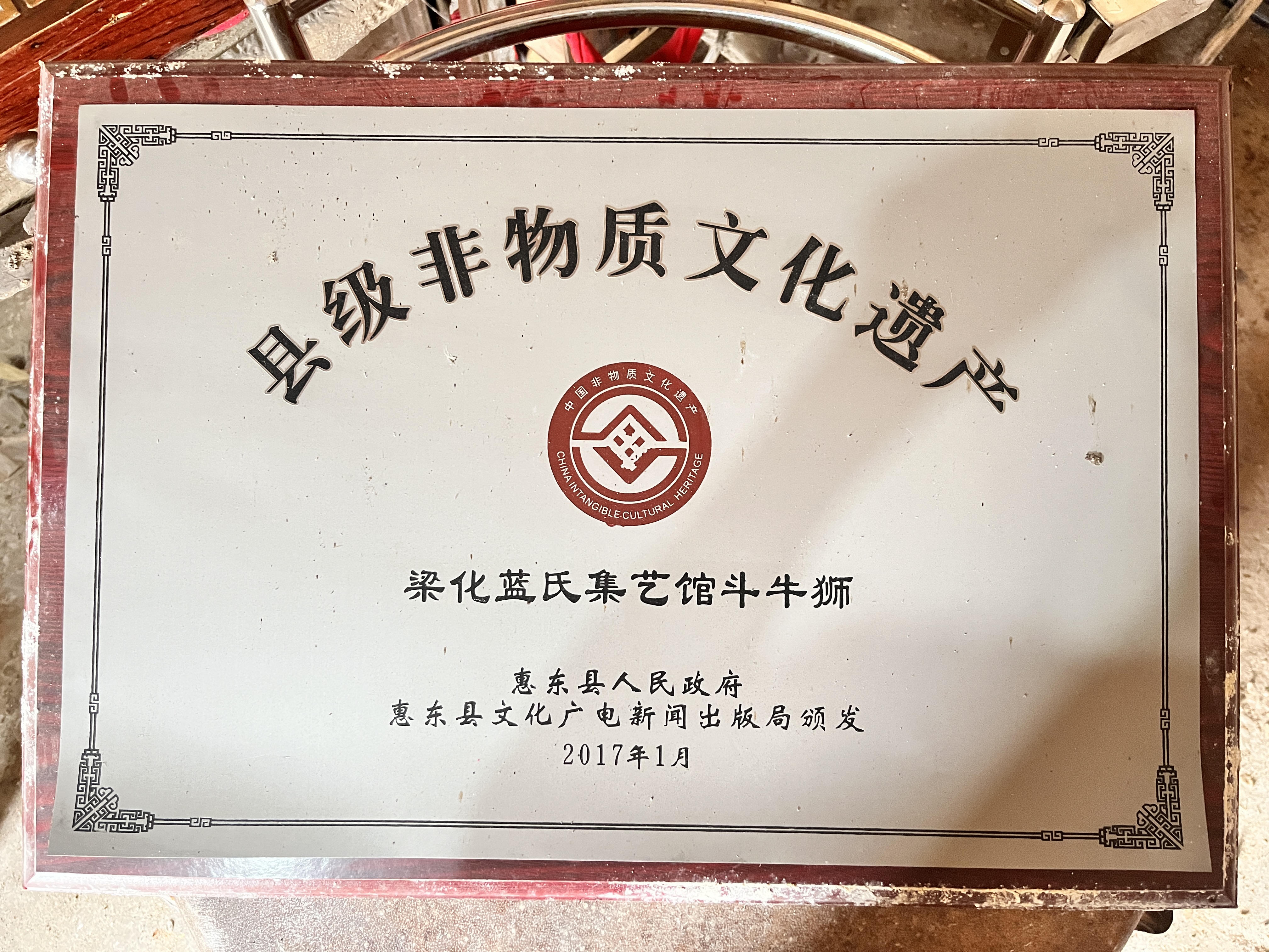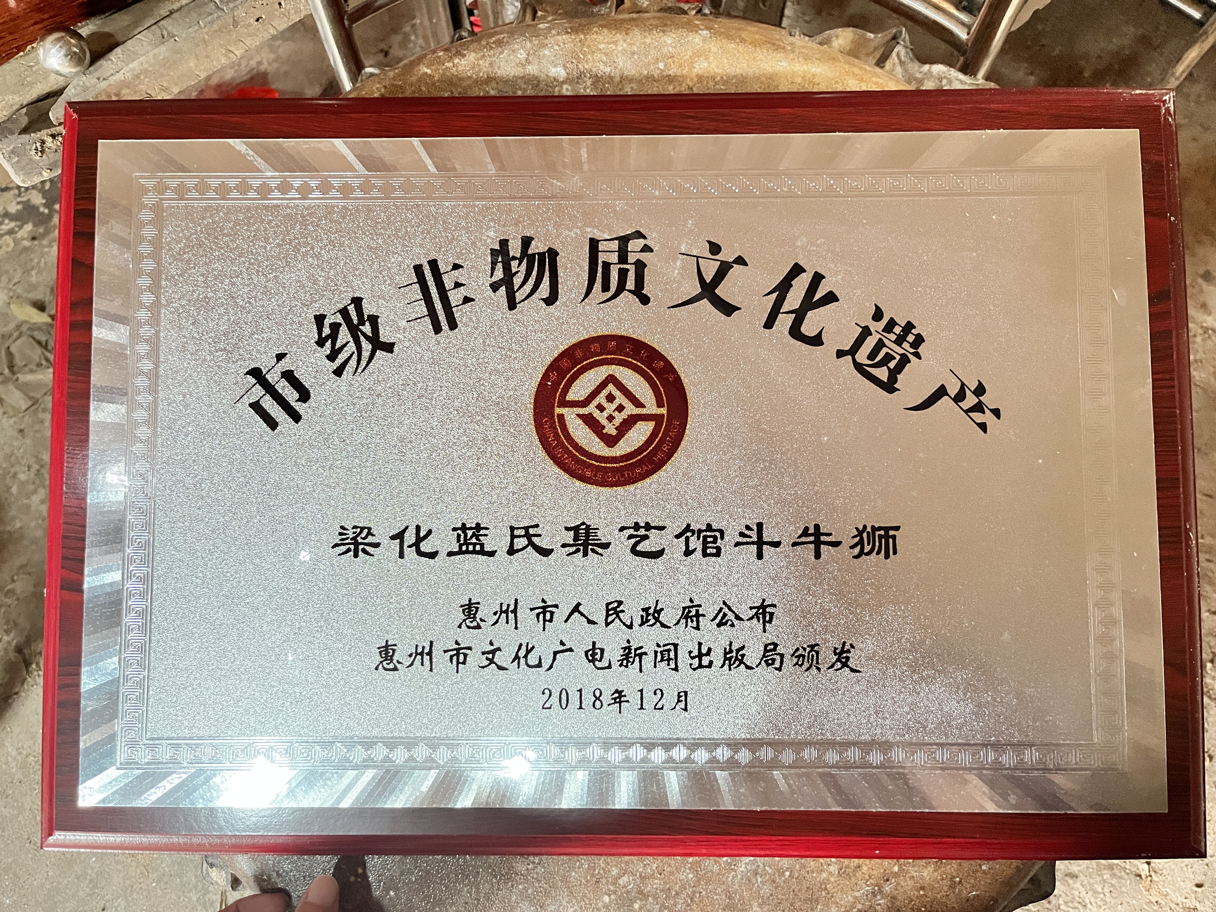 ▲2017年1月,梁化蓝氏集艺馆斗牛狮被评为县级非物质文化遗产。