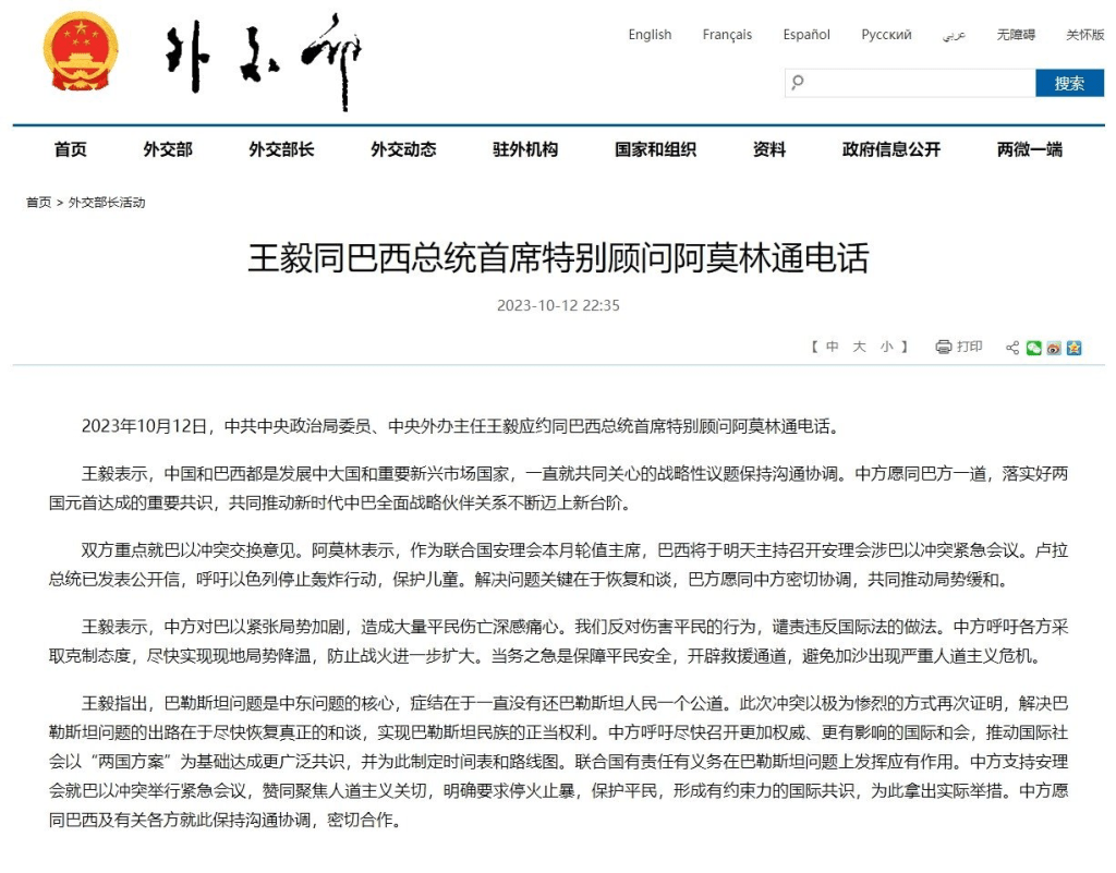 中共中央政治局委员、中央外办主任王毅昨(12)日应约与巴西总统首席特别顾问阿摩林通电话。王毅表示,巴勒斯坦问题是中东问题的核心,症结在于一直没有还巴勒斯坦人民一个公道。解决巴勒斯坦问题的出路在于尽快恢复真正的和谈,呼吁尽快召开更加权威、更有影响的国际和会,推动以“两国方案”为基础达成更广泛共识;中方支持联合国安理会就巴以冲突举行紧急会议。