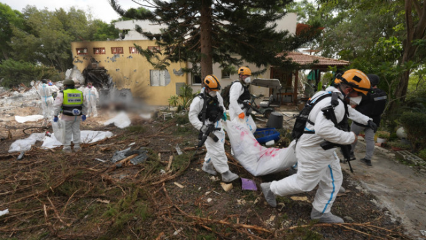 ▲以色列士兵从集体农庄Be’eri抬走哈马斯武装份子的尸体。 美联社