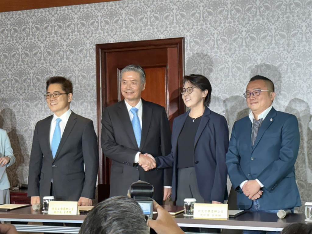 ▲侯竞办执行长金溥聪、柯办总干事黄珊珊14日下午展开商谈,会前召开记者会。